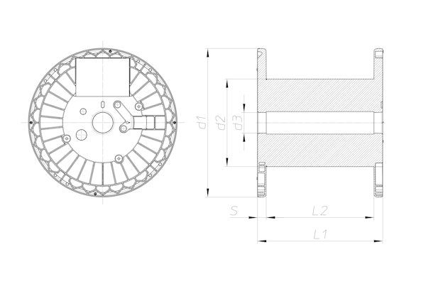 Flange Ø | Barrel Ø | Central bore Ø | Width | Winding width | Flange thickness |