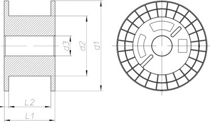 Flange Ø | Barrel Ø | Central bore Ø | Width | Winding width | Flange thickness |