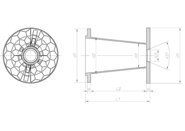 | d1 [mm] | d2 [mm] | d3 [mm] | L1 [mm] | L2 [mm] | S [mm] | V [cm³] | d4 [mm] | d5 [mm] | E1 [mm] |