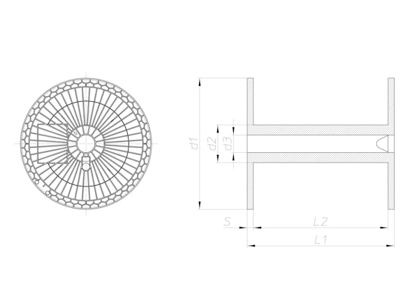 | d1 [mm] | d2 [mm] | d3 [mm] | L1 [mm] | L2 [mm] | S [mm] | V [cm³] | d4 [mm] | d5 [mm] | E1 [mm] |